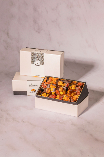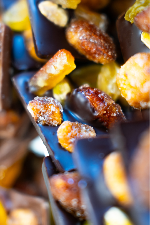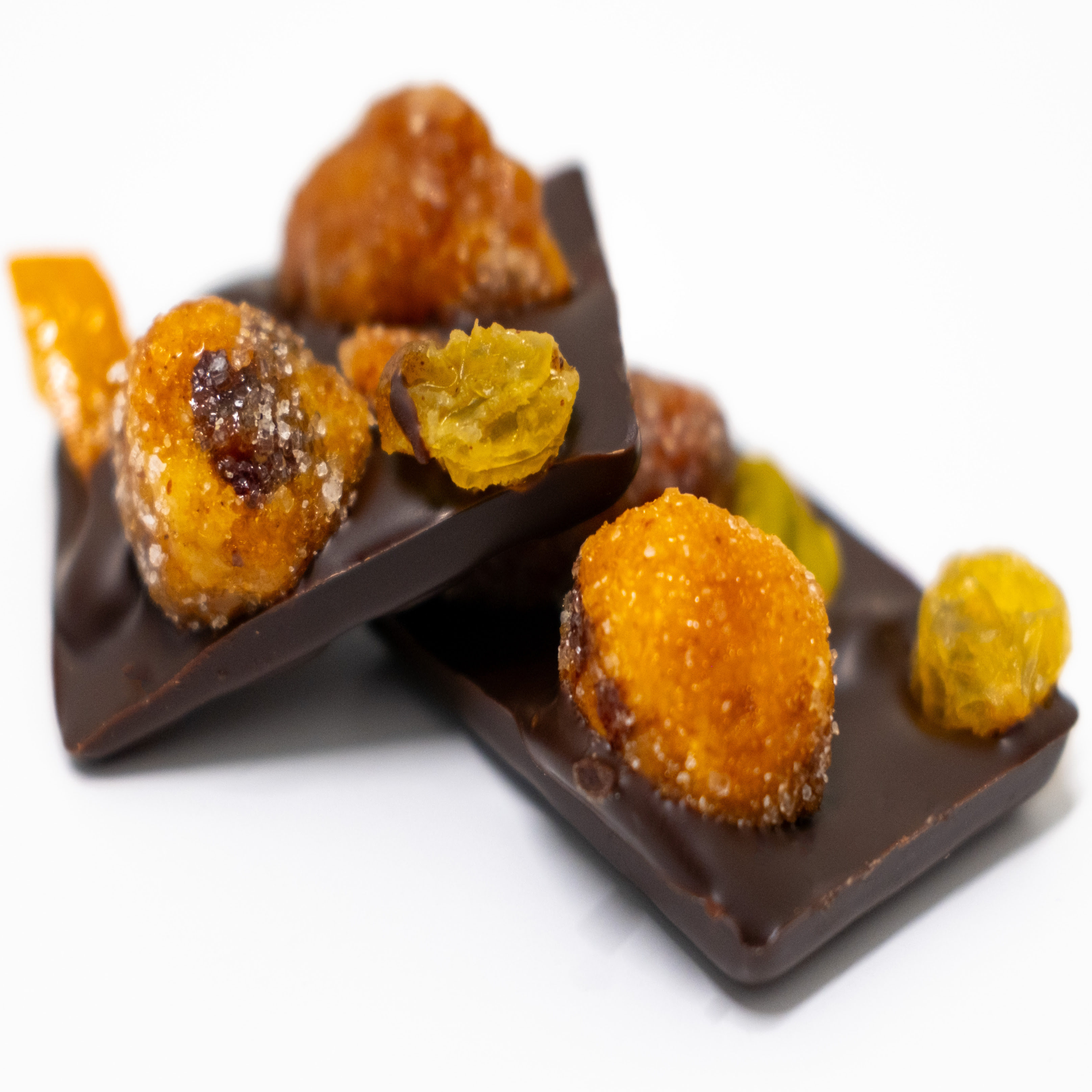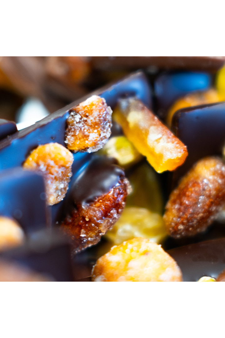 Chaque fine tablette est soigneusement confectionnée à partir de chocolat noir de qualité supérieure, puis généreusement garnie de fruits secs et confits sélectionnés avec soin : noisettes du Piémont, amandes croquantes, pistaches d’Iran, raisins Golden et éclats d’orange confite.