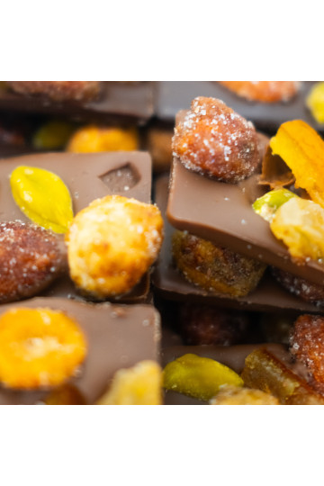 Nos tablettes sont délicatement parsemées de noisettes du Piémont, amandes croquantes, pistaches d’Iran, raisins Golden et éclats d’orange confite, soigneusement sélectionnés pour leur qualité et leur goût authentique.