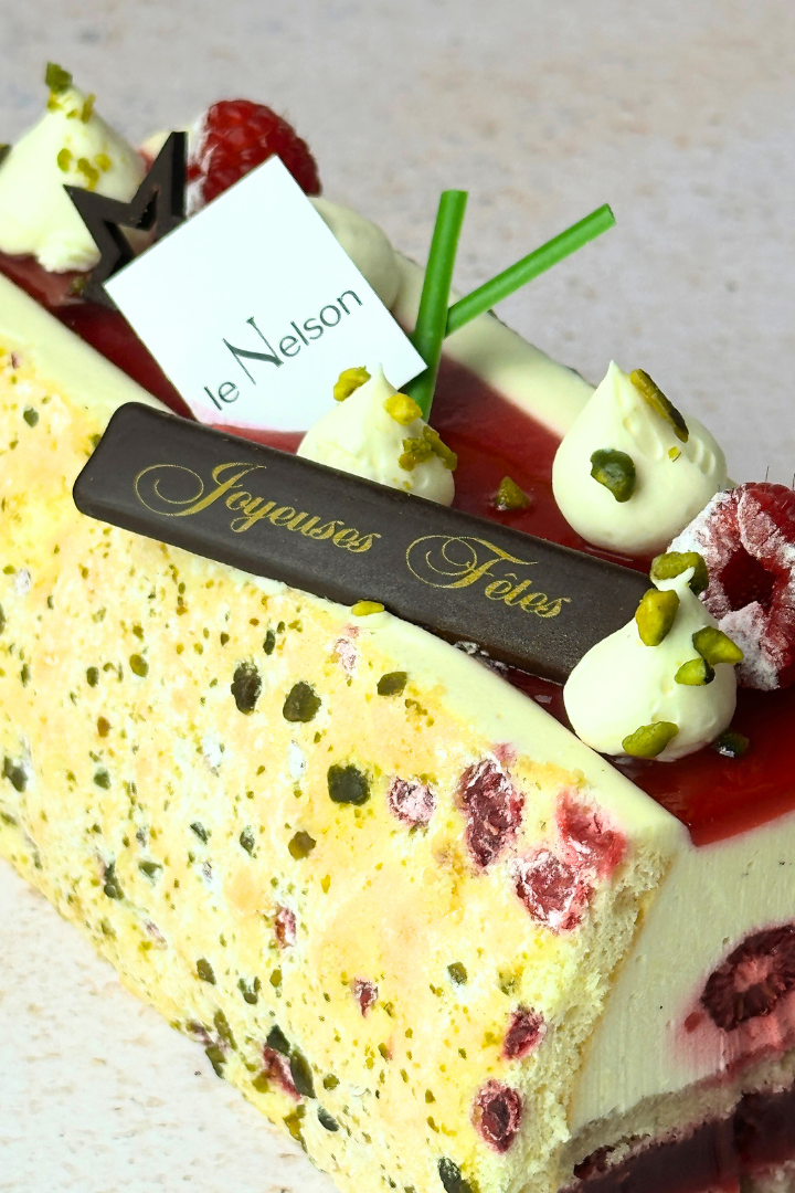 Succombez à l’incontournable bûche La Framboise, une création raffinée qui allie légèreté, fraîcheur et gourmandise.