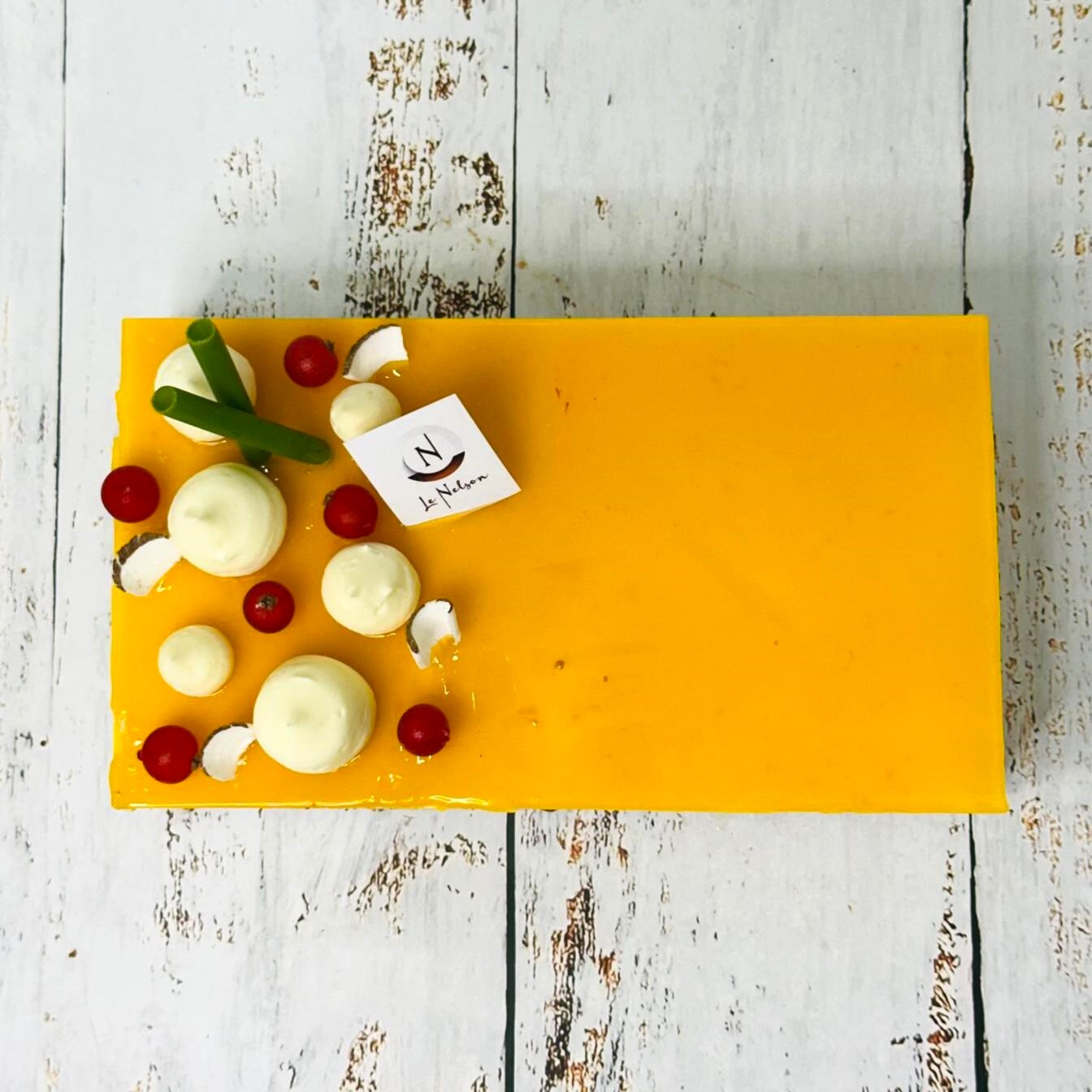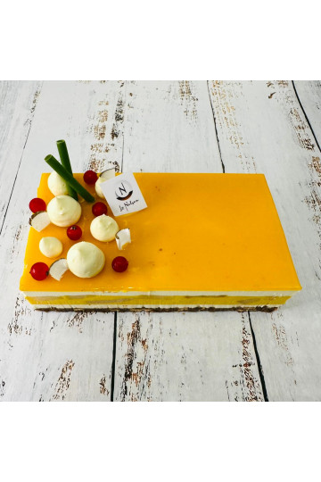 Crème légère mascarpone chocolat blanc, cœur crémeux mangue passion, morceaux d'ananas, biscuit crumble praliné croustillant pointe de fleur de sel