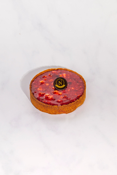 Pate sablé, frangipane et tendre appareil aux pralines roses.