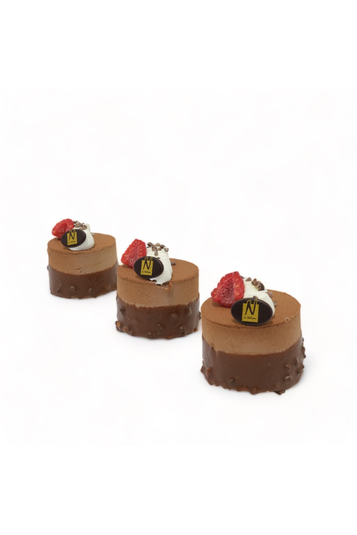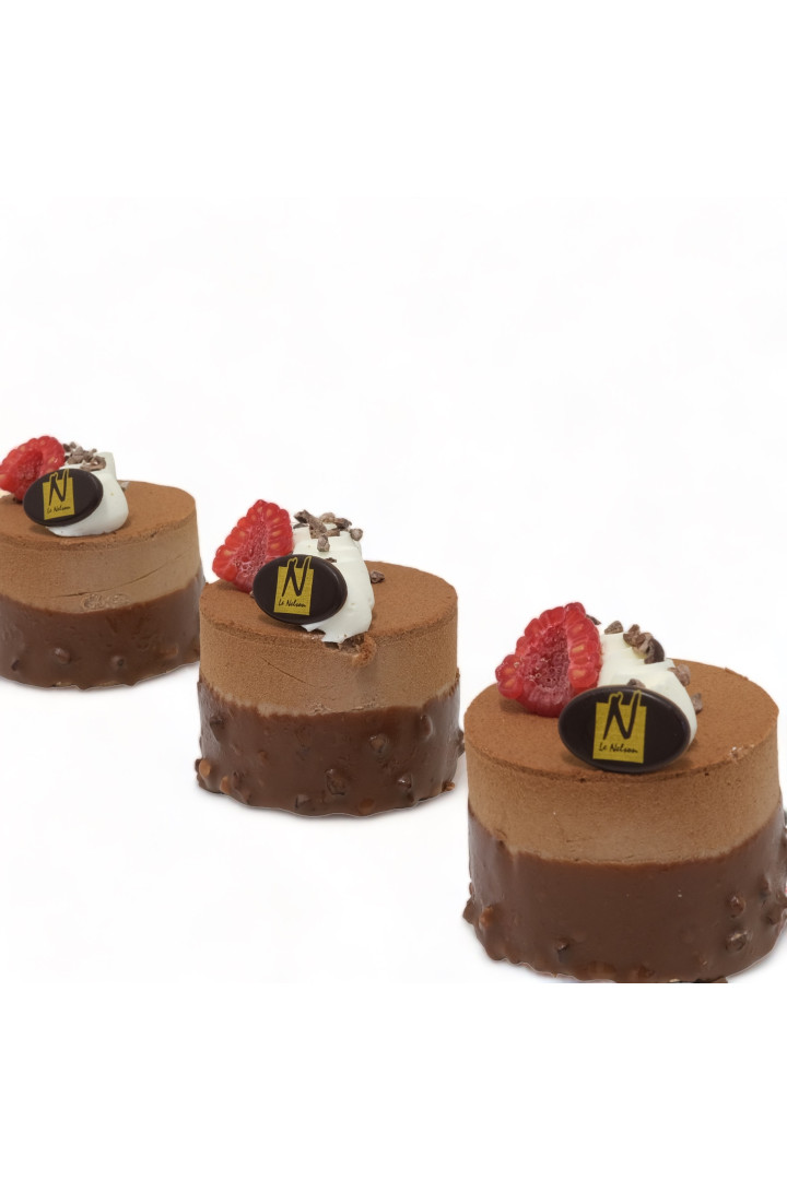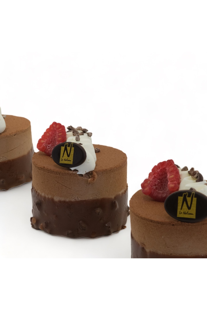 Mousse chocolat noir, crémeux vanille, morceaux de framboises, biscuit.