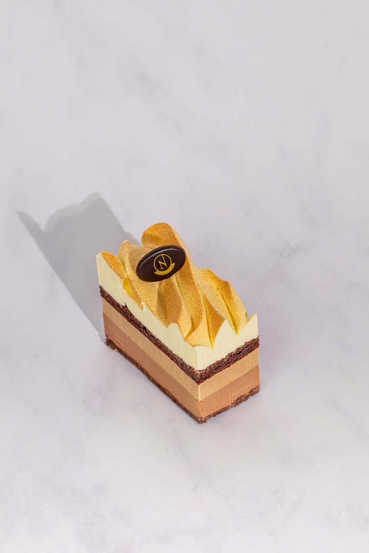 Ganache montée chocolat blanc, ganache montée chocolat lait, mousse chocolat noire, biscuit chocolat sans farine.