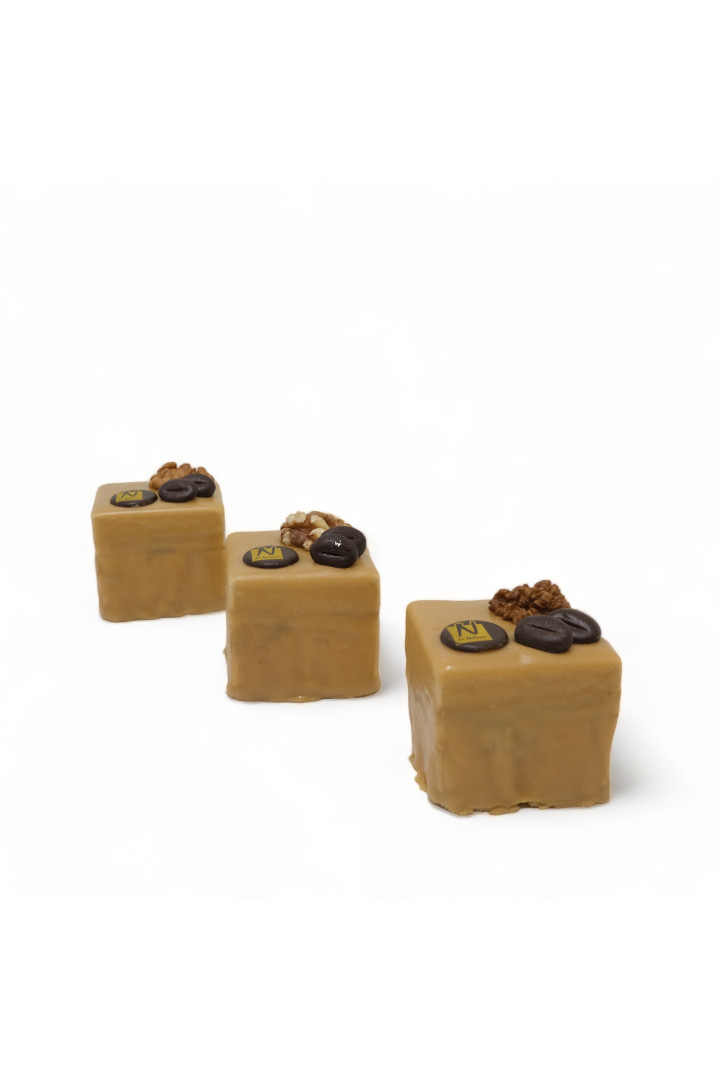 Crème au beurre moka, brisures de noix, biscuit noix et glaçage fondant au café.
