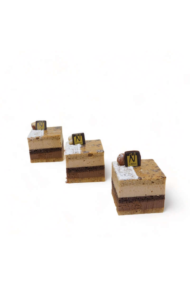 Mousse praliné noisette piémont et mousse au chocolat noir, biscuit noisette.