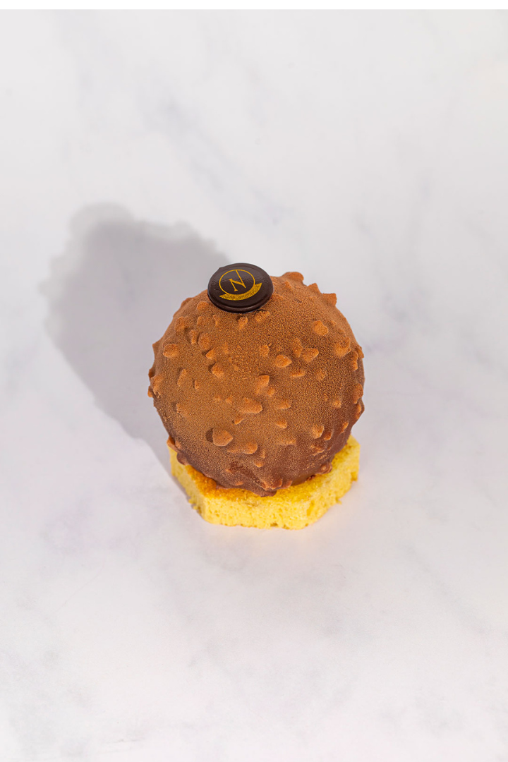 Mousse chocolat noir, cœur praliné noisette coulant sur biscuit madeleine glaçage rocher.