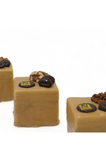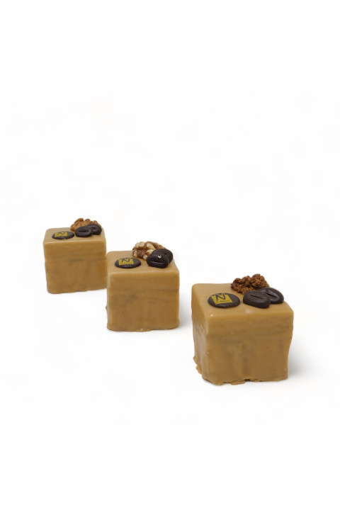 Crème au beurre moka, brisures de noix, biscuit noix et glaçage fondant au café.