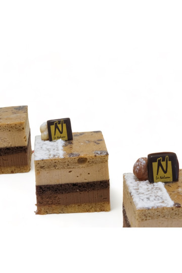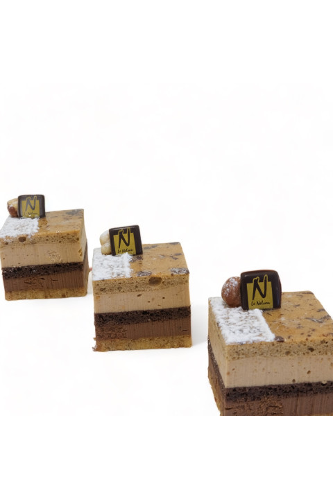 Mousse praliné noisette piémont et mousse au chocolat noir, biscuit noisette.