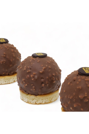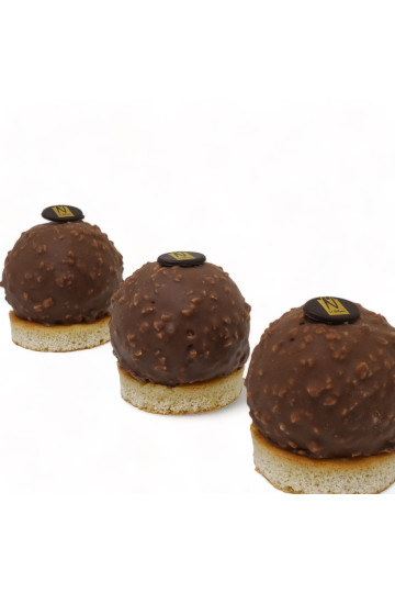 Mousse chocolat noir, cœur praliné noisette coulant sur biscuit madeleine glaçage rocher.