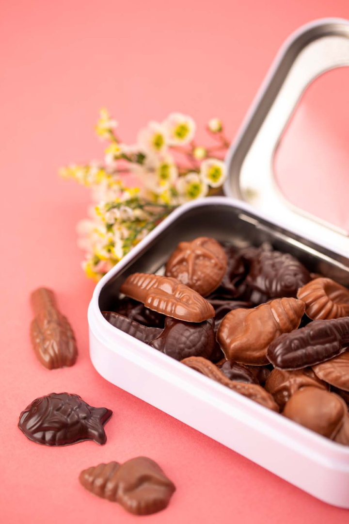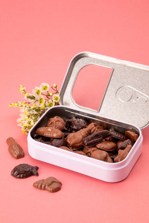 Boite métallique façon "sardines" à collectionner, remplies de fritures noir 64% et lait 34%