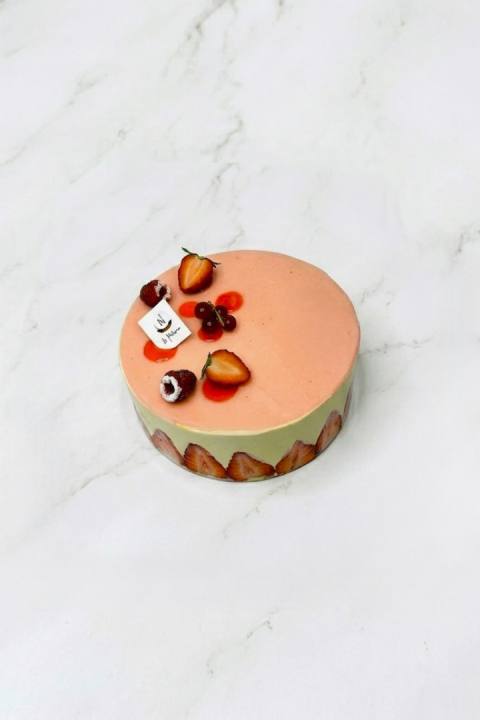 Biscuit cuillère, coulis de fraise, fraises fraiches et crème diplomate vanille de Madagascar.