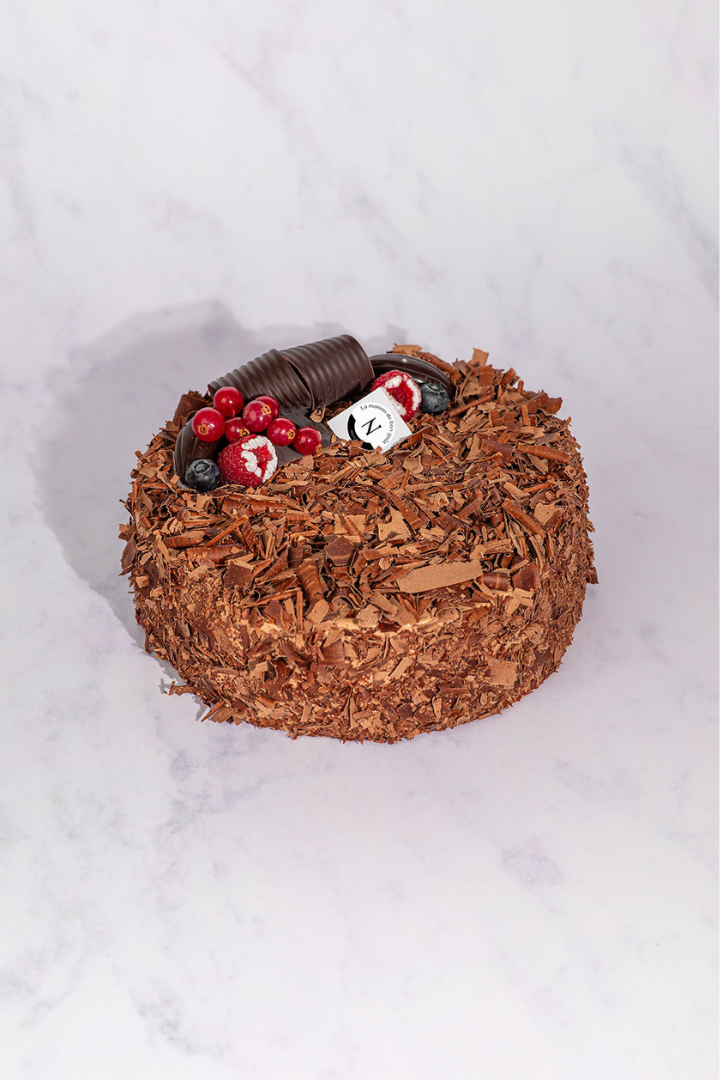 Génoise au chocolat, ganache alégée à la chantilly, copeaux de chocolat et griottes à l'alcool vielle tradition