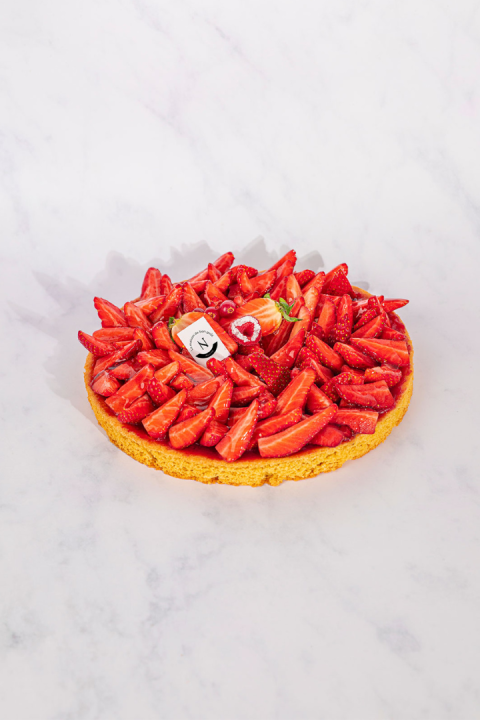 Sous un soleil gourmand, découvrez notre tarte aux fraises, un véritable hymne à l’été. De magnifiques fraises rouges, brillantes et juteuses, sont délicatement déposées à la main sur un confit de fraises maison, riche en goût et en intensité fruitée.