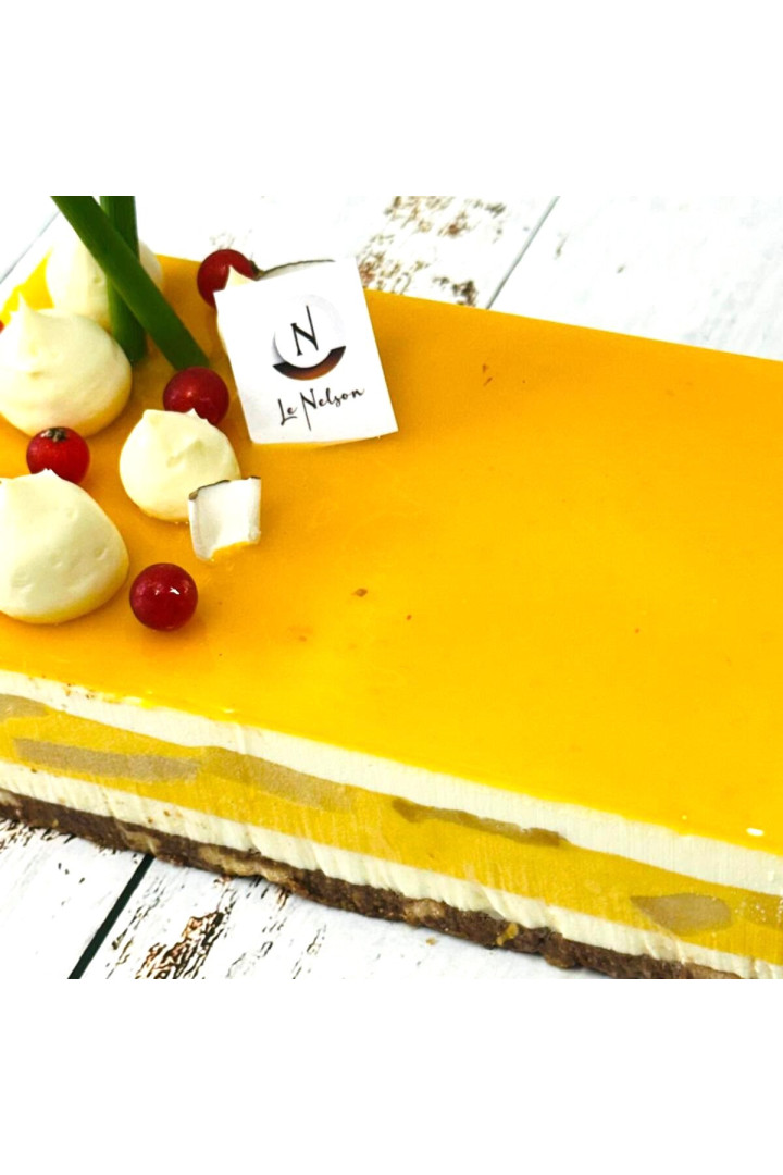 Crème légère mascarpone chocolat blanc, cœur crémeux mangue passion, morceaux d'ananas, biscuit crumble praliné croustillant pointe de fleur de sel